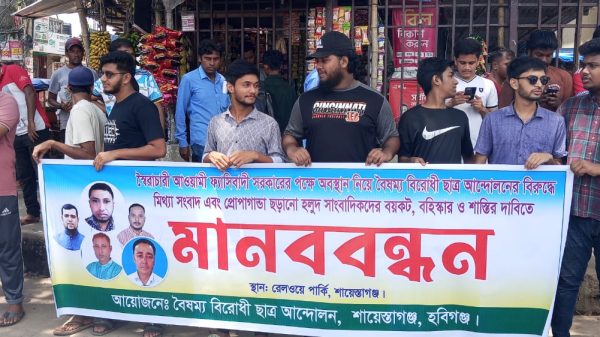 শায়েস্তাগঞ্জে ৫ সাংবাদিকের বিরুদ্ধে বৈষম্য বিরোধী ছাত্র আন্দোলনের মানববন্ধন।